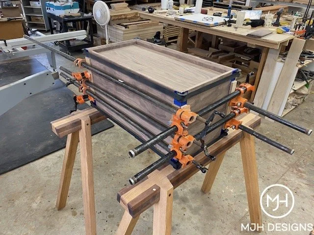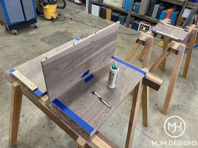 A special fixture was built to safely cut the double tapers on the short walnut legs.