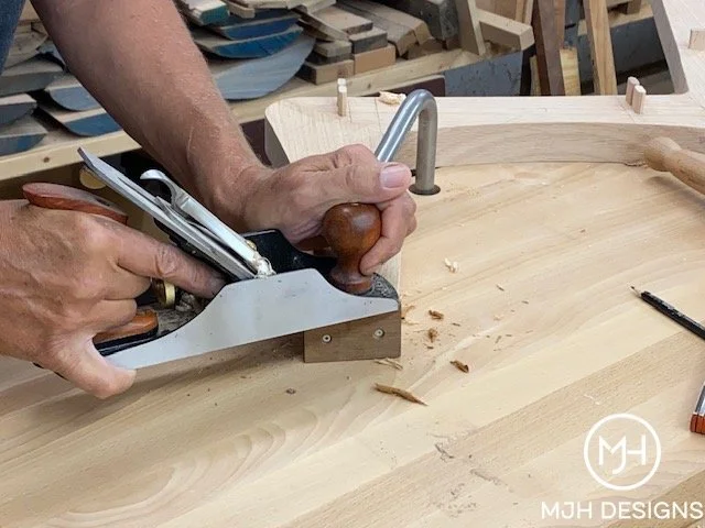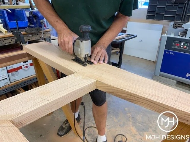 After gluing up the frames, the rough outlines were traced onto the oak parts and cut out with a jig saw. The curves were smoothed with a router following a template, and hand sanding.