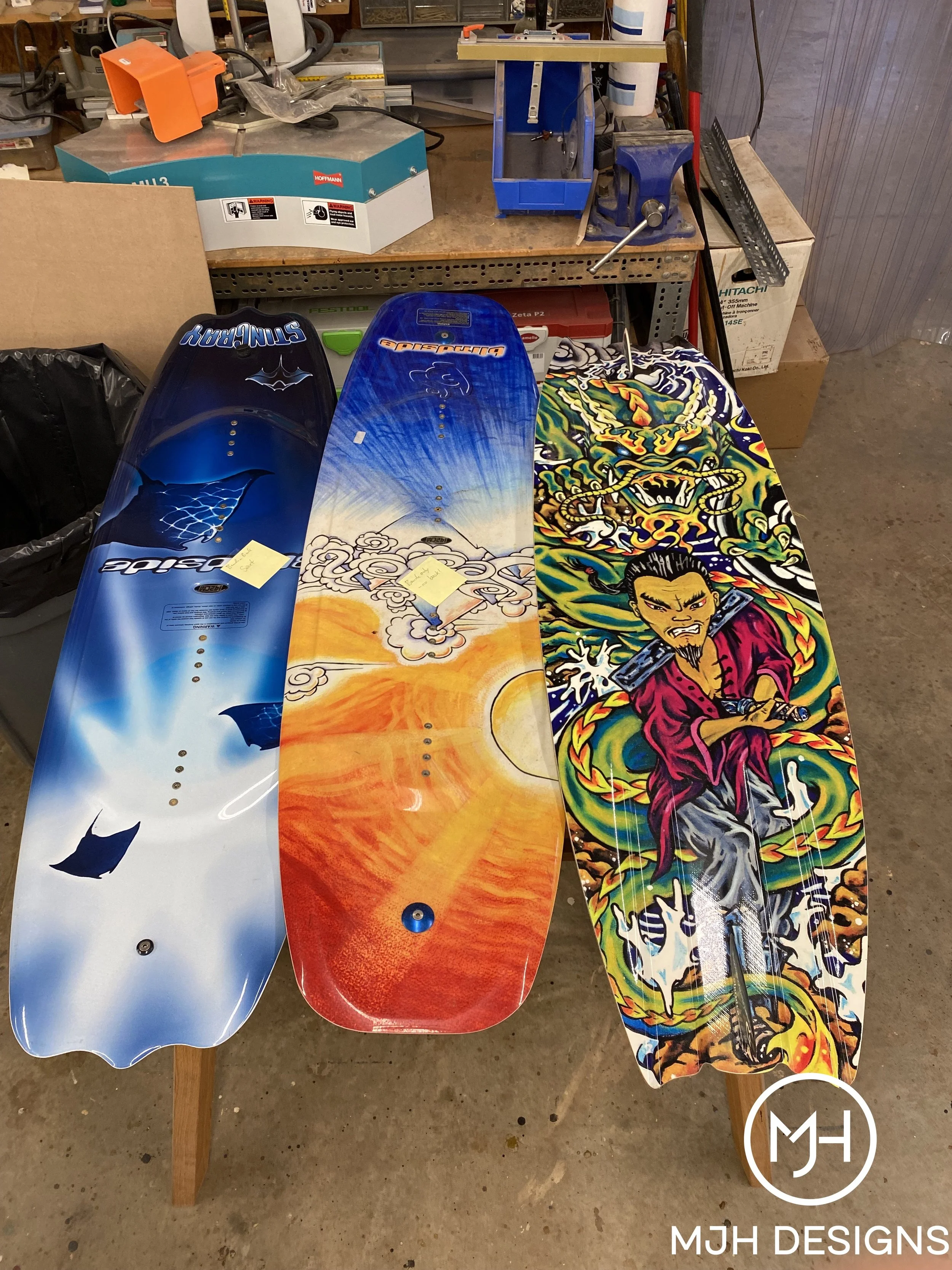 This project started with the client telling me about the wonderful memories he and his family had made every summer riding wakeboards on a lake. Now being a little older, he no longer used the boards but, rather than just keeping them in the garage, he was looking for a way to display and enjoy them. And I agreed, with cool graphics like those it would be shame to just keep them on a shelf!