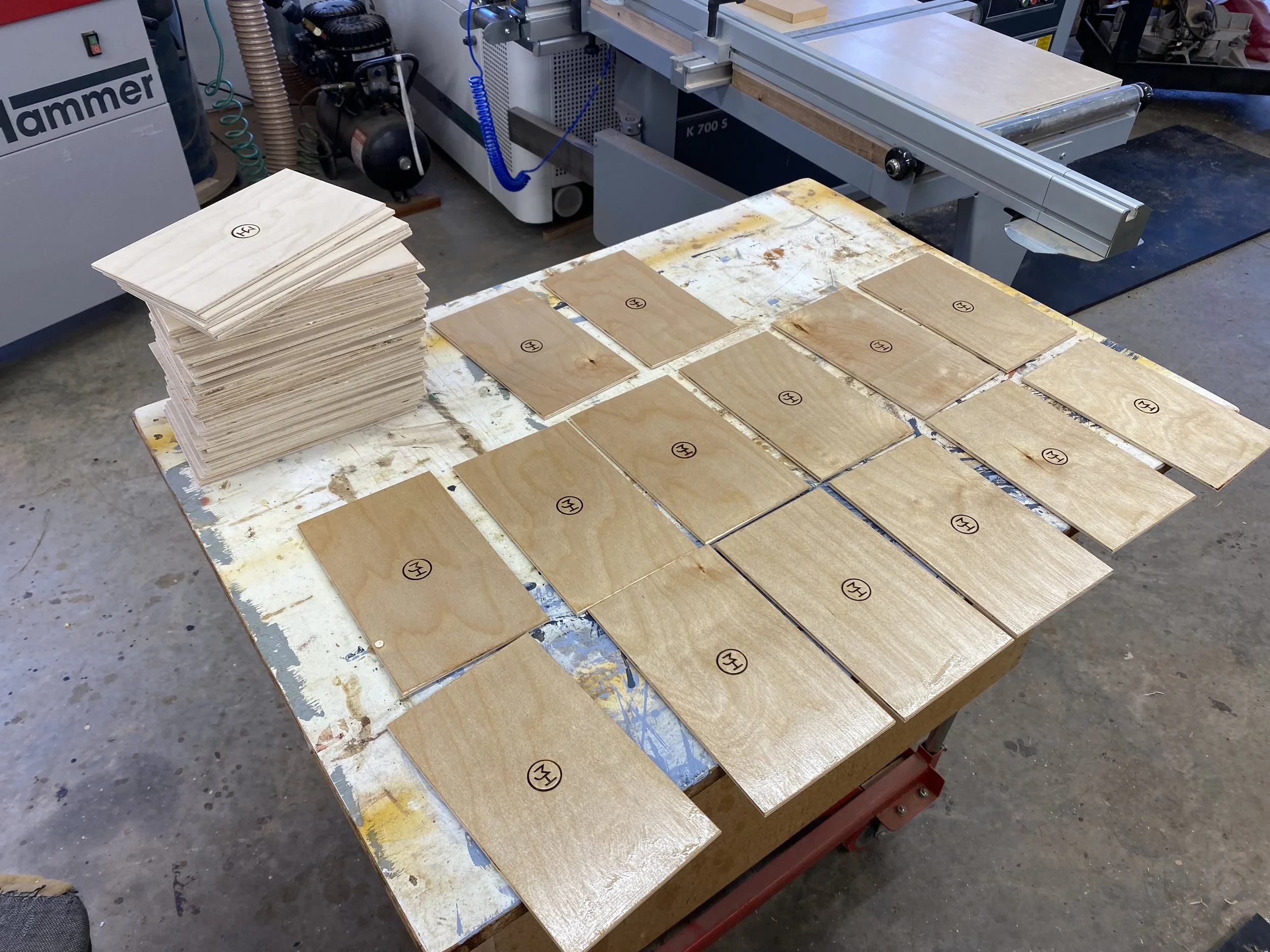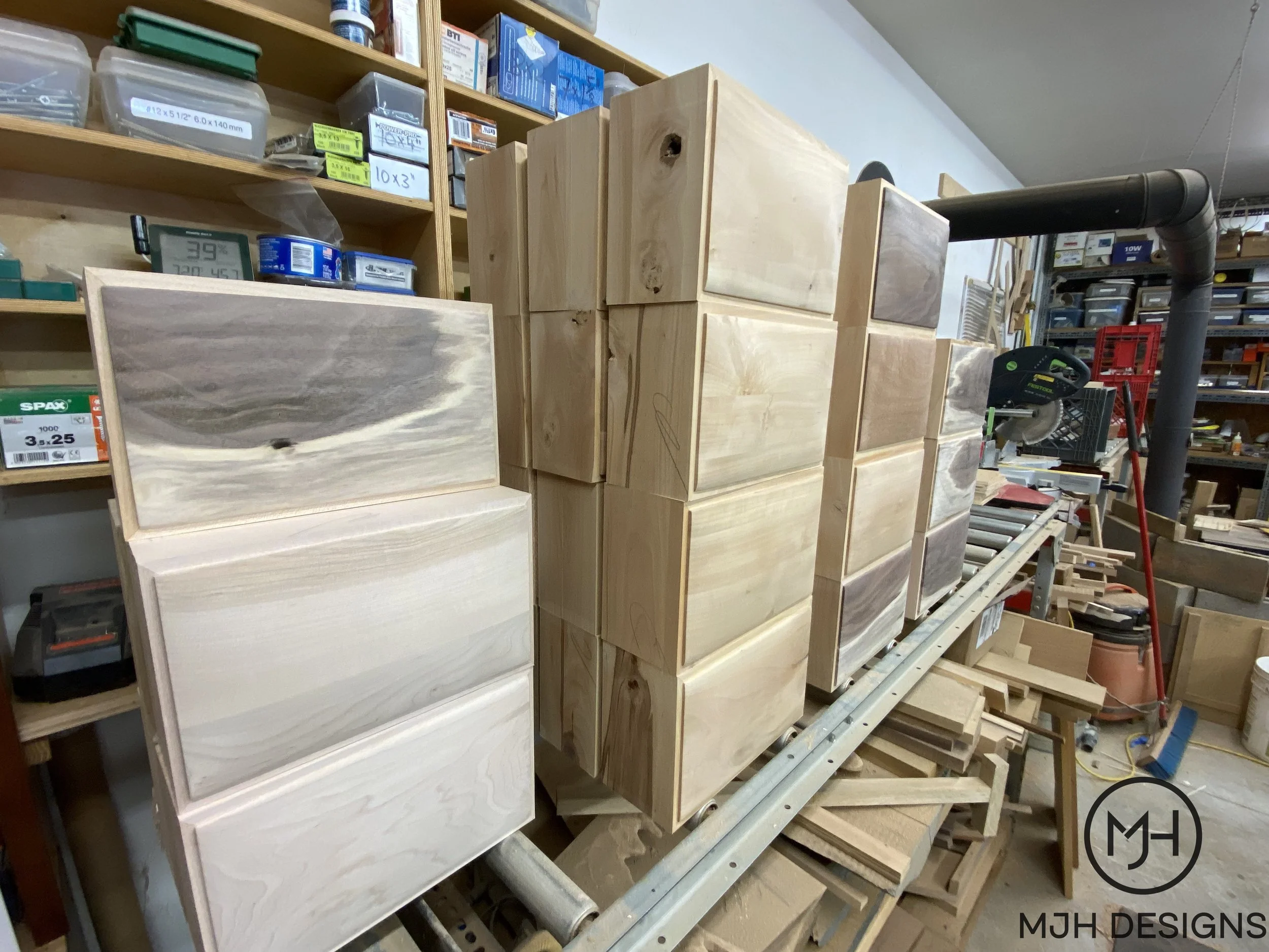 A stack of box sides in different wood species, ready for interior finish.