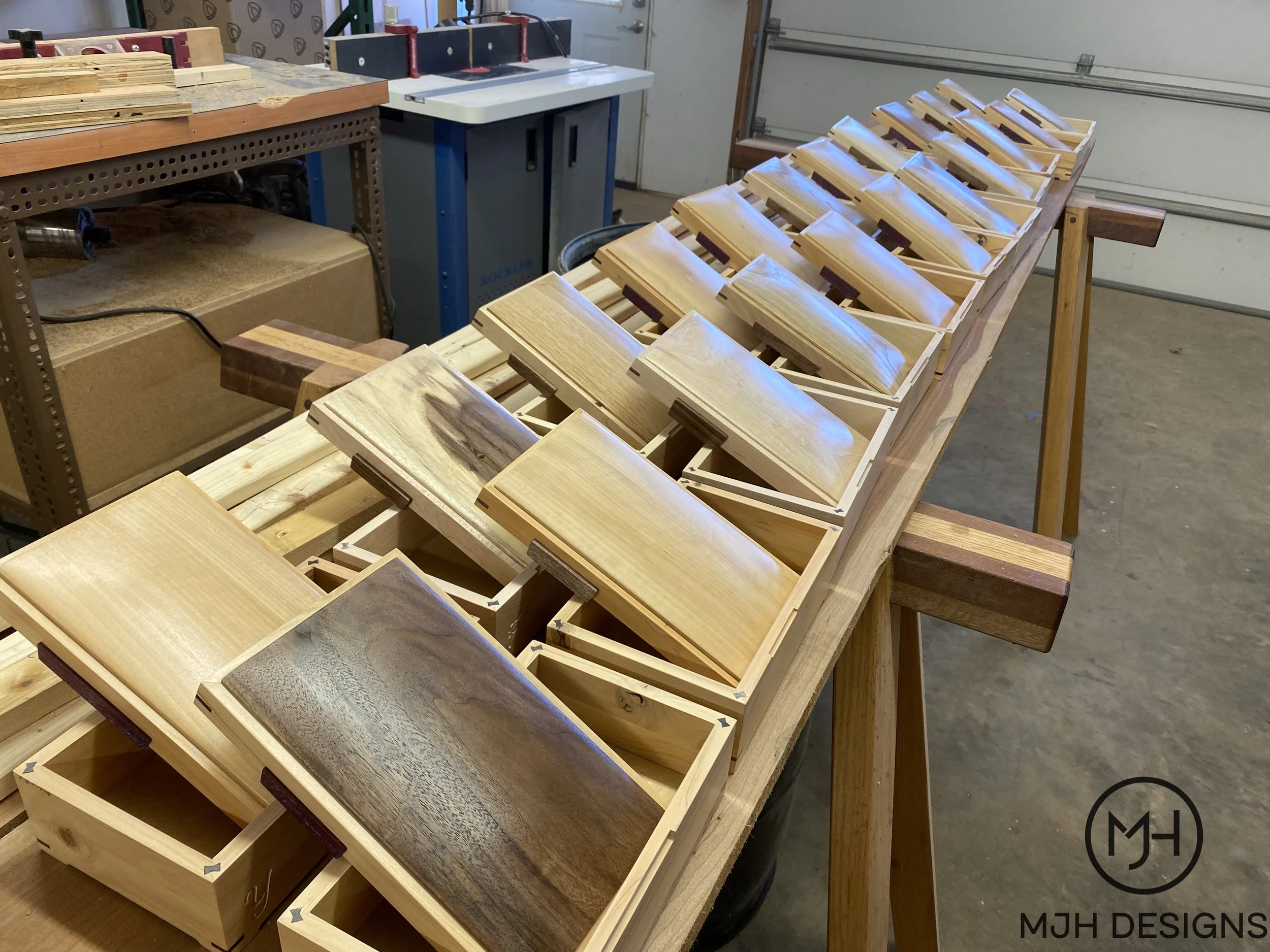 Bottoms were made from 5mm maple plywood and the tops are made of solid wood with a domed “pillow” shape. This gave the boxes a unique design to set them apart.