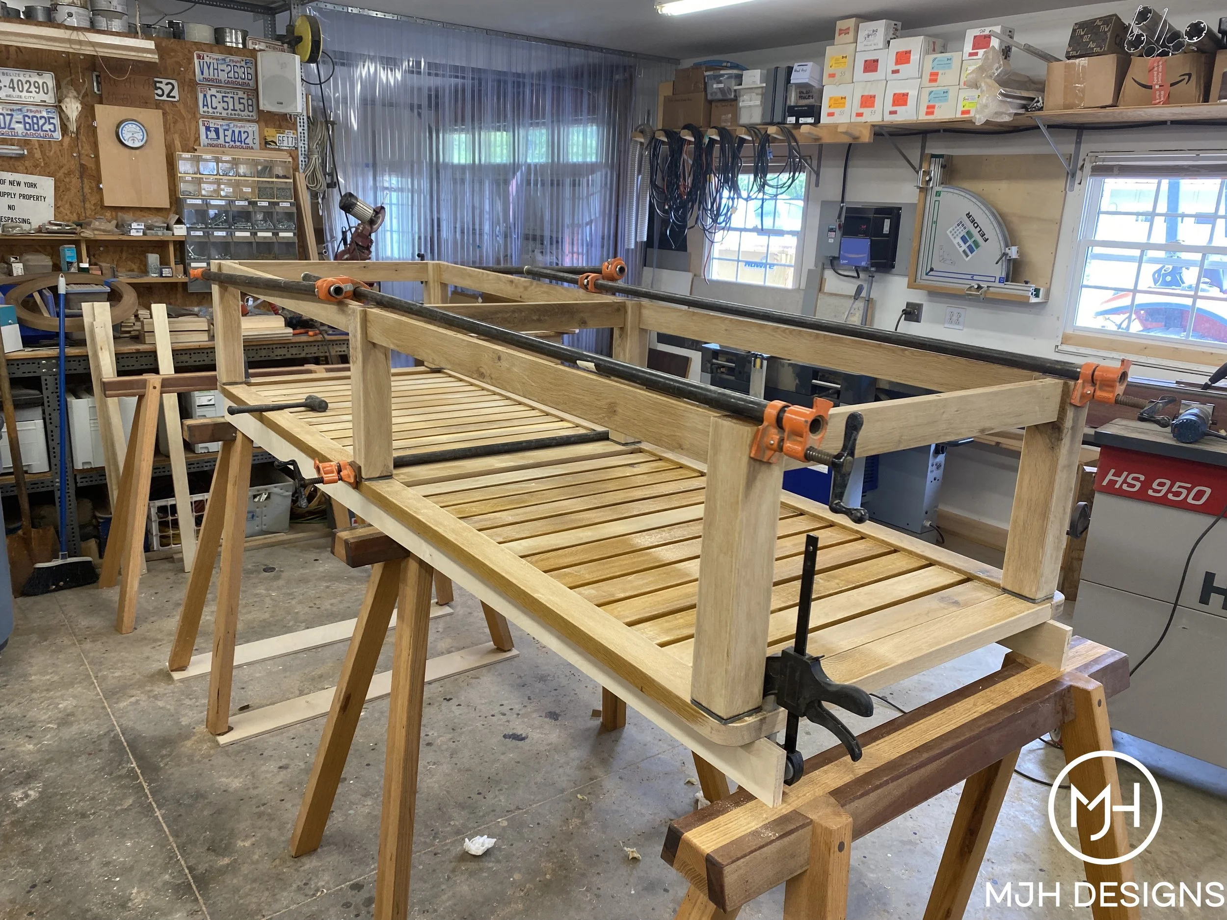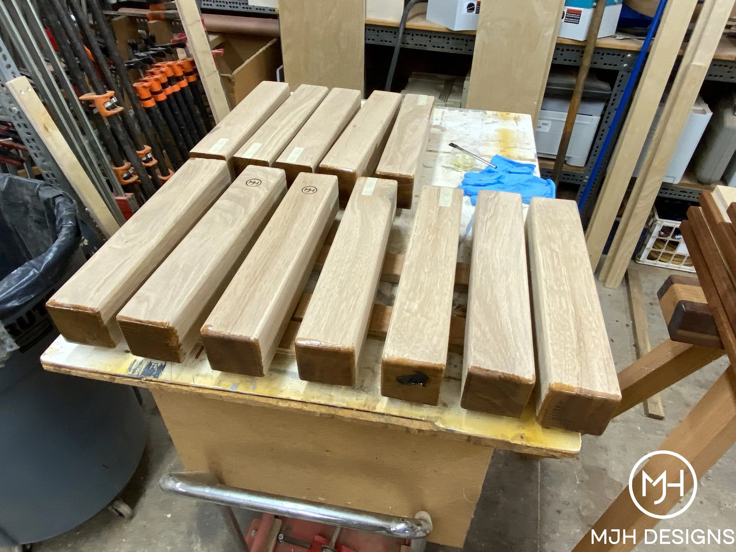 The slats were cut to size, mortised in the ends and then finished with multiple coats of marine grade finish prior to assembly.